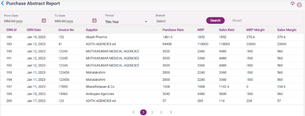1. Purchase Abstract Report: The purchase is made from a supplier, along with the MRP margin, sales margin, purchase rate, and sales rate will be displayed in the report.
