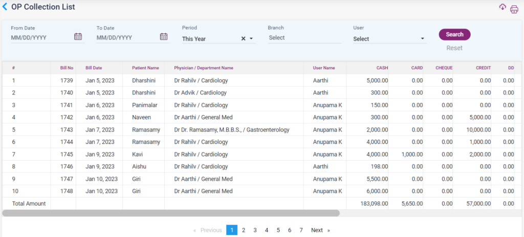 1. OP Collection List: This report shows the list of bills of the patient who used the OP services. The details of the amount paid by cash, card, cheque, credit, and DD will also be displayed.