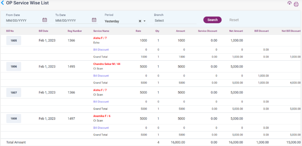 1. OP Service Wise List: The list shows the details of patients with the service name, amount of the service, service discount, bill discount, and total amount.