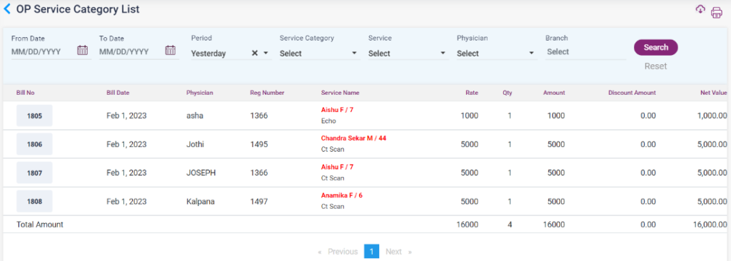 1. OP Service Category List: This report shows the list of services the patient uses with the physician’s name and the bill amount details.