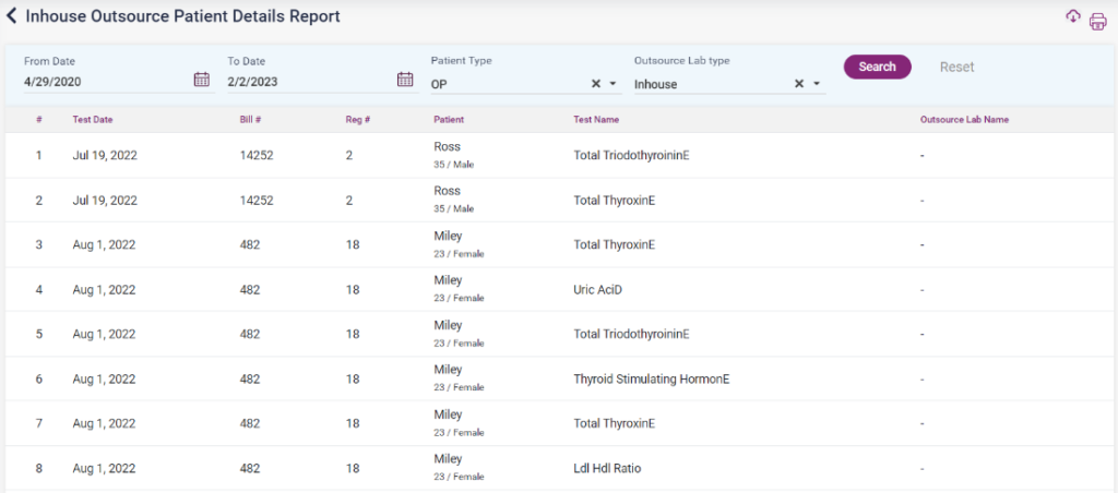 1. In-house Outsource patient details report: In this report, the user can filter the lab reports done inside the hospital (Insource) and the lab tests sent to an outside lab (Outsource) with the patient’s name and test name.