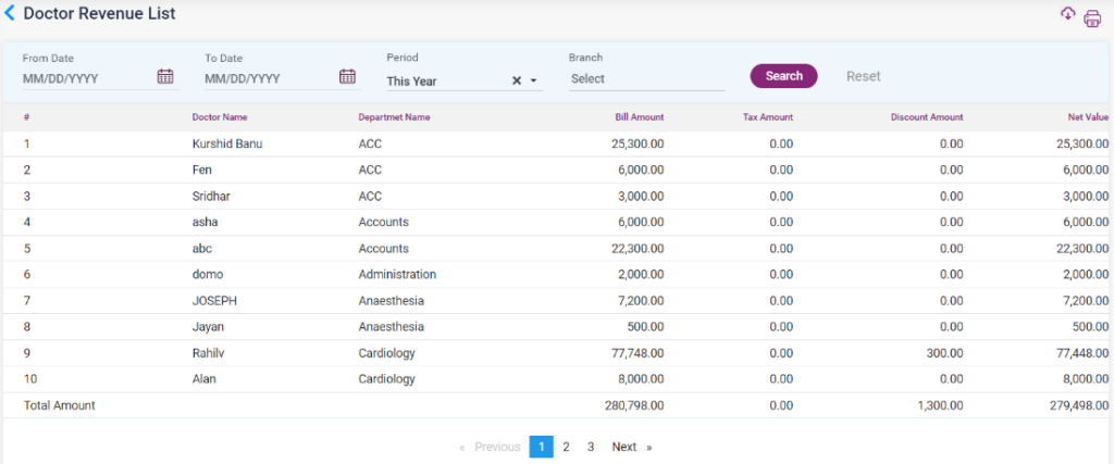 1. Doctor Revenue List:  The revenue for the doctors with their name and department, bill amount, discount amount, tax amount, and net value will be displayed.