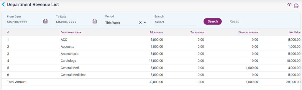 1. Department Revenue List: The revenue for the particular departments with department name, bill amount, tax amount, discount amount, and net value will be shown in this report