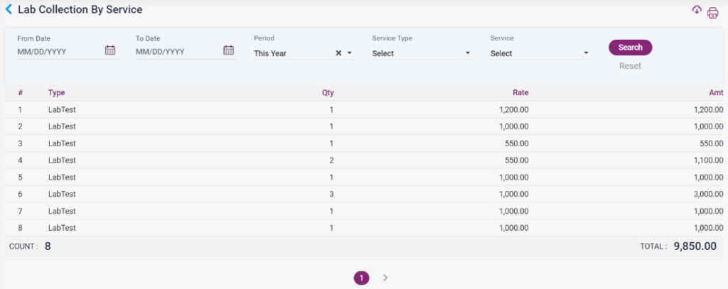1. Lab Collection by Service: The list of Lab tests with the amount according to the service will be shown in this report.