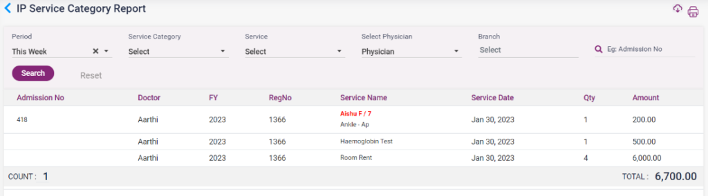 1. IP Service Category Report: The list of services, service given date, quantity, amount, the doctor who prescribed the service, reg no, and admission number will be displayed in this report.