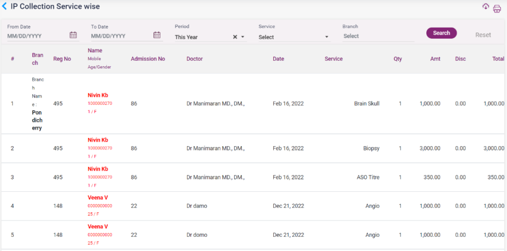 1. IP Collection Service Wise: The list shows the details of patients with the service name, doctor name, admission number, amount, and discount amount.