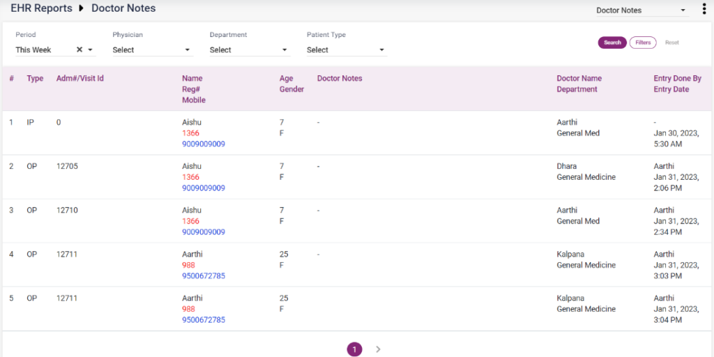 1. Doctor Notes: The doctor notes given to the IP patients will be shown according to the search in this report.