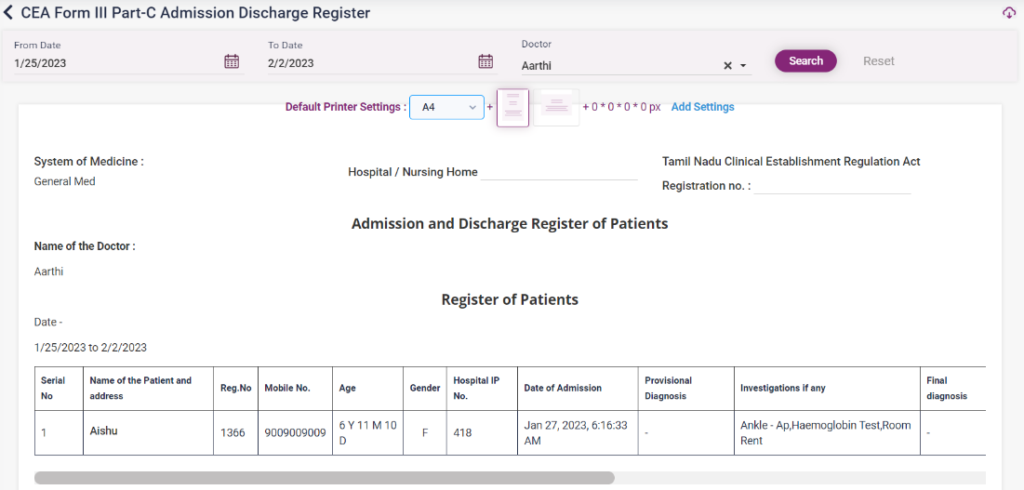 1. CEA Admission Discharge: The details of the patient’s admission, the doctor under which the patient is admitted, discharge details, investigations, treatment, and diagnosis will be displayed in a table form in the report according to the selected from date to date and doctor name.