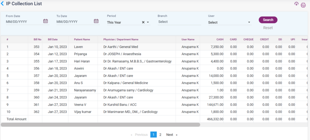 1. IP Collection List: This report shows the list of bills of the patient who used the IP services. The details of the amount paid by cash, card, cheque, credit, and DD will also be displayed.