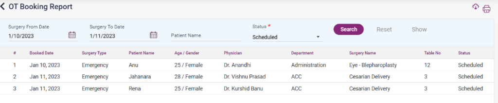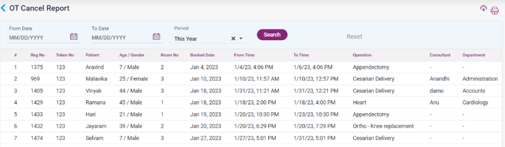 - Booking Cancel List: The list of cancelled OTs with patient details, booking details, and physician and surgery details will be displayed according to the search criteria.