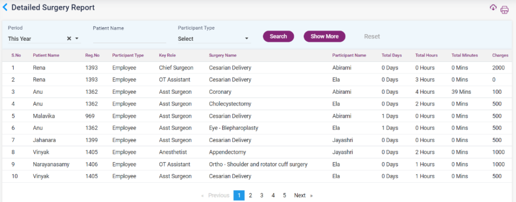 - Consolidated Surgery Report: The list of employees involved in surgery with their key roles and the timing of the surgery will be displayed in this report.