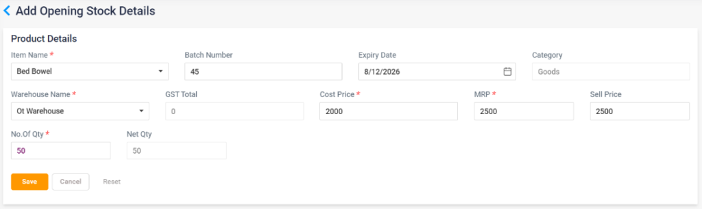- Click the Save button to add the item to the opening stock list. Click the Cancel button to cancel the entry and return to the previous page. Click on the Reset button to clear the details entered.