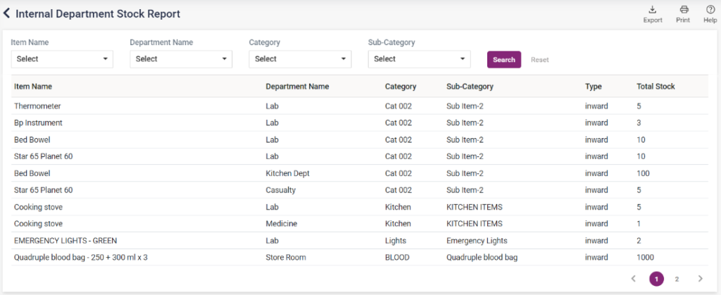 - The inventory stock will be displayed on this page according to the internal department.
