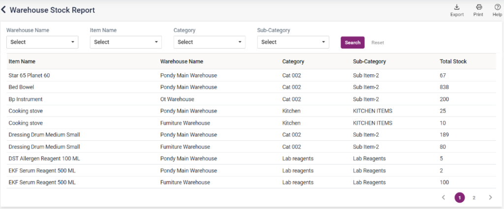 - The available stock can be searched by warehouse name, item name, category and subcategory.