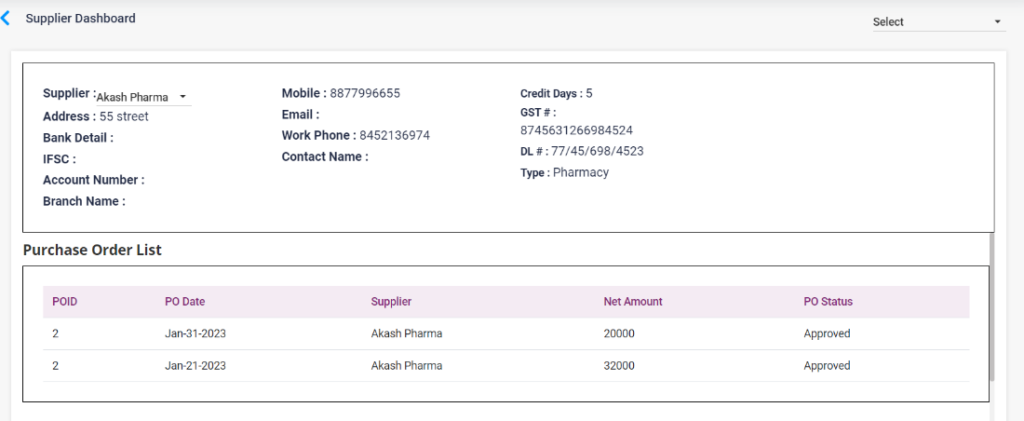 On selecting the Supplier Dashboard, the Supplier master page will be loaded. The payment for supplier dues can be made from this page by selecting the last Edit icon and following the supplier payment process.