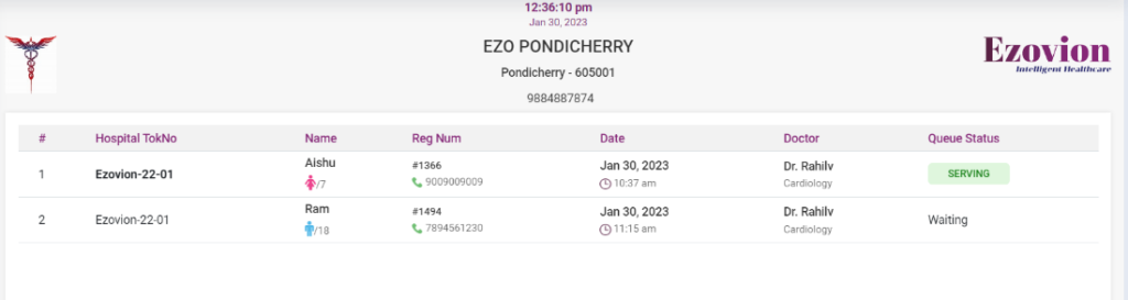 - When the doctor starts serving the patients, then the name of the patient, the doctor name and the status “Serving” for that patient will be displayed in a list here.