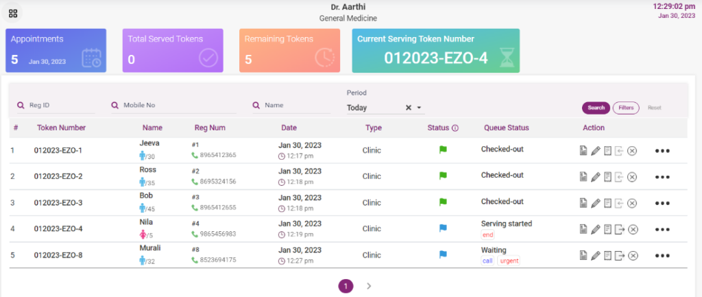 - If the doctor is ready to call the patient, he can click on the “call” button. Upon clicking, “start serving” button will be available. Click on the start serving button, then the queue status will be changed to “Serving”. This will also be updated on the appointment queue page.